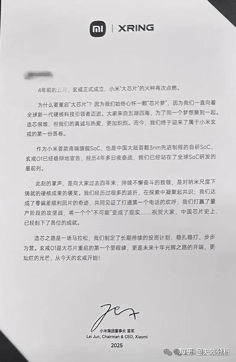 雷军在给员工的话中提到:“作为小米首款高端旗舰 SoC,也是中国大陆首颗 3nm 先进制程的自研 SoC,玄戒 O1 已经雄辩地宣告,经历 4 年多日夜奋战,我们已经站在了全球 SoC 研发的最前列。中国芯片史上已经刻下了各位的成就。”